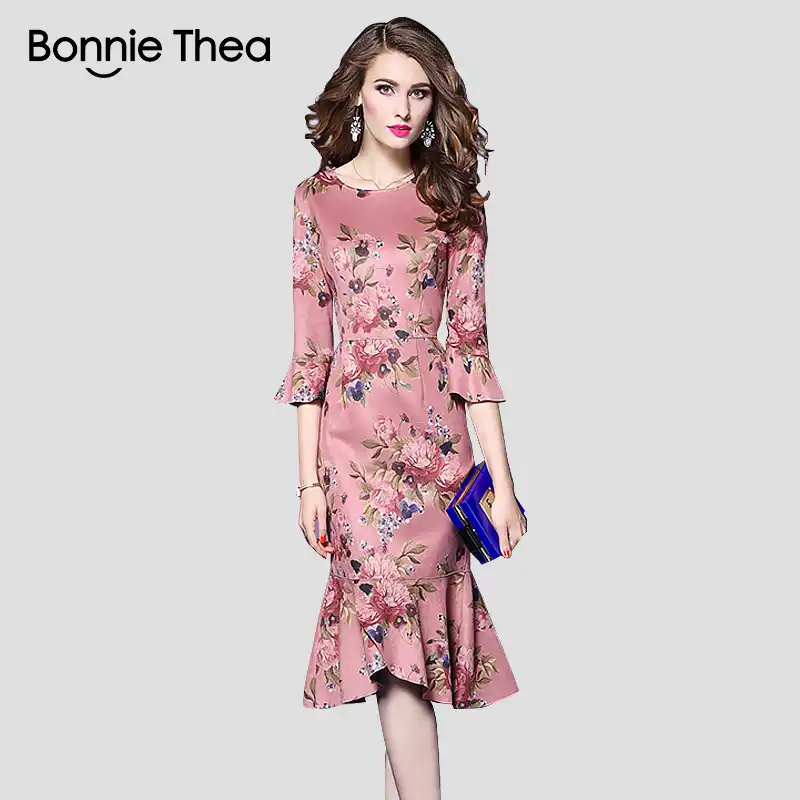 Autumn Women Plus Size Mermaid Dress Female Pink Floral Bodycon