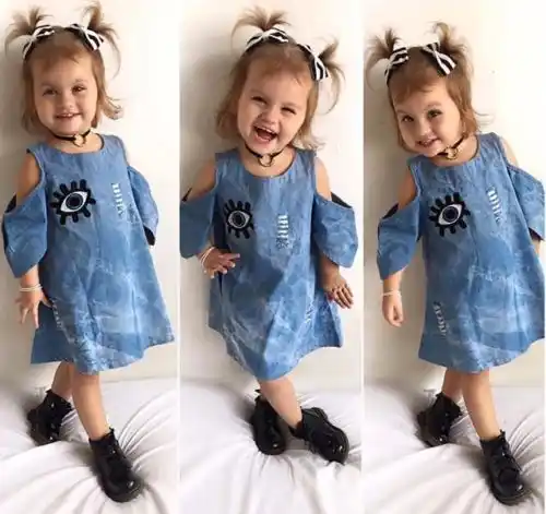 2018 New Summer Fashion Kids Eyelash Jeans Dress Baby Girls Off