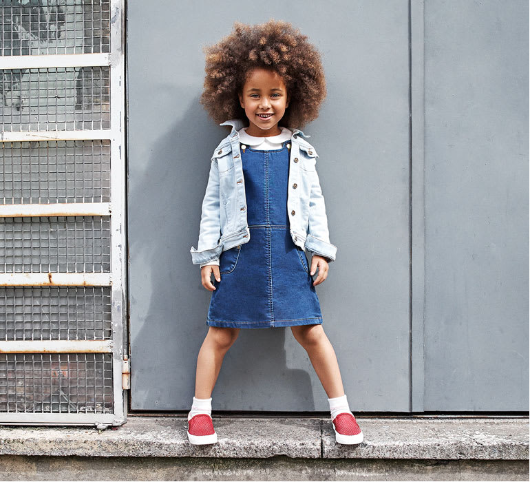 Afro American Little Girl Wearing Denim Clothes Outdoors Fashion
