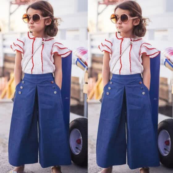 Toddler Kid Baby Girl Ruffle Stripe Tops Blouse Denim Pants Jeans