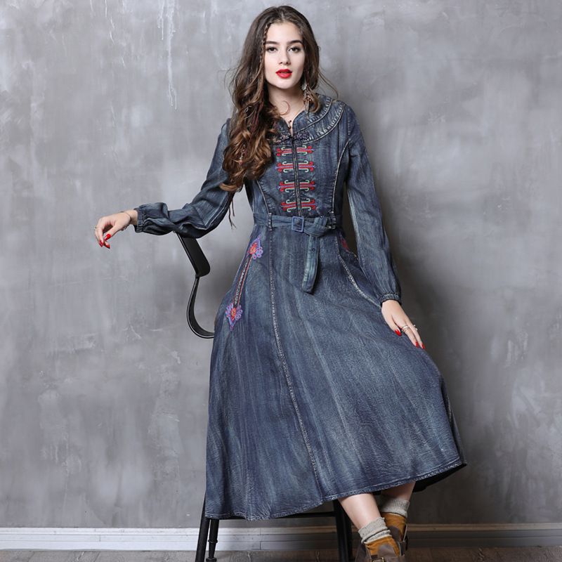 Retro Folk Custom Style Denim Dress Women Frog Button Embroidery