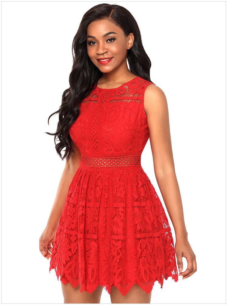 Crimson Lace Tiered Short Sleeveless Cocktail Dress Lunss