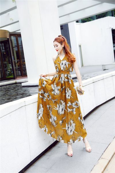 2018 Hot New Korean Floral Chiffon Dress Halter Backless Dress