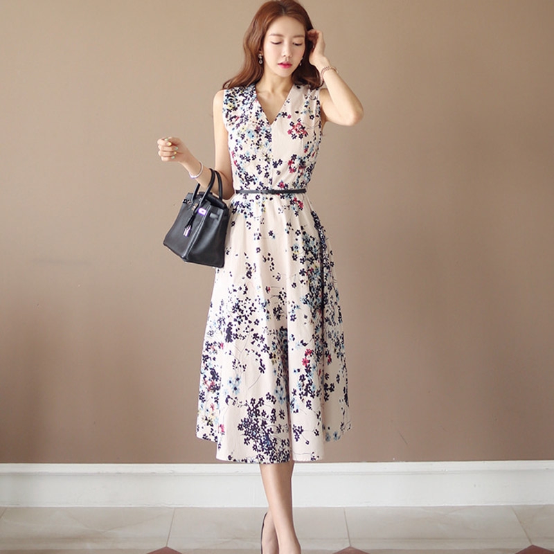 Summer Dress Korean Style Elegant V Neck Waist Long Print Pendulum