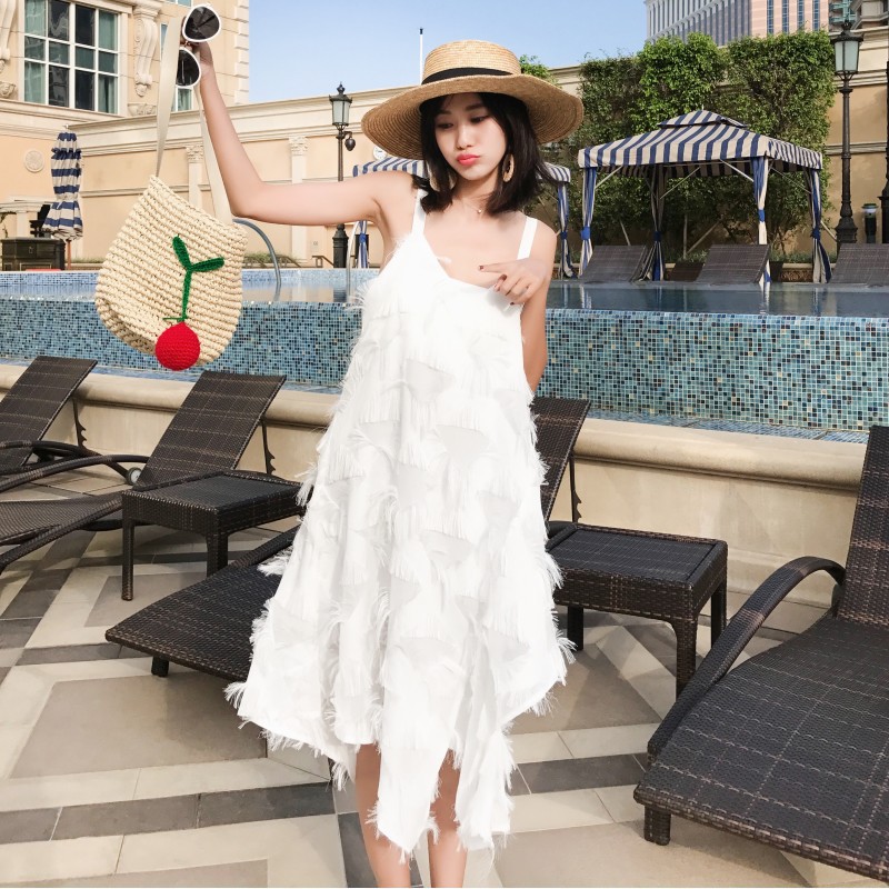 New Korean Style White Feather Dress Long Gown Beach Dress Slip