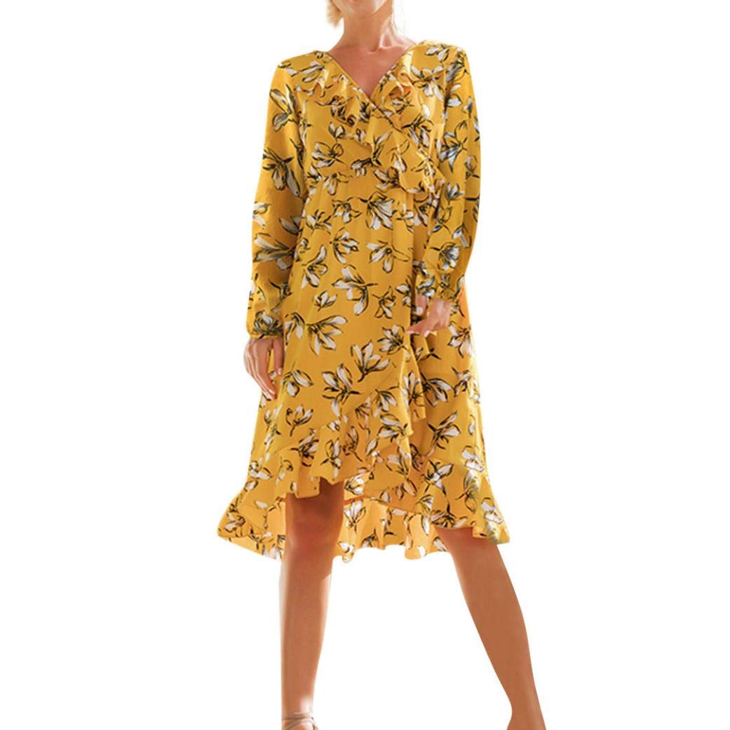 Women S Loose Short Sleeve V Neck Ruffles Print Casual Yellow